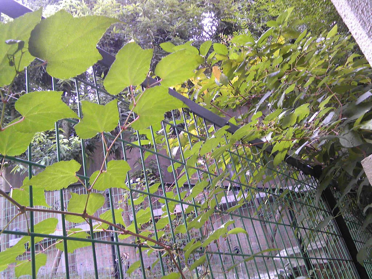 洗濯物を干すベランダのさくにのぶどうの葉がからんできれいです。小さな実が紫や薄紫に色付くのももうすぐ。葉も少し枯れると一気に秋の気配に・・・